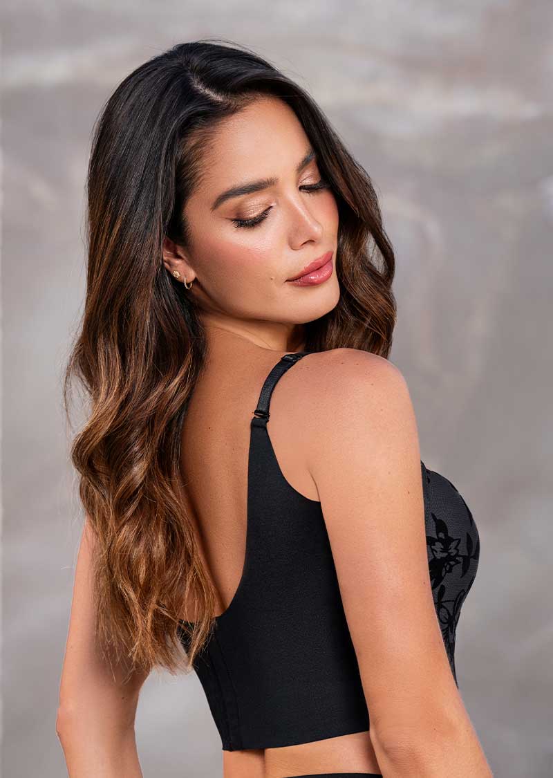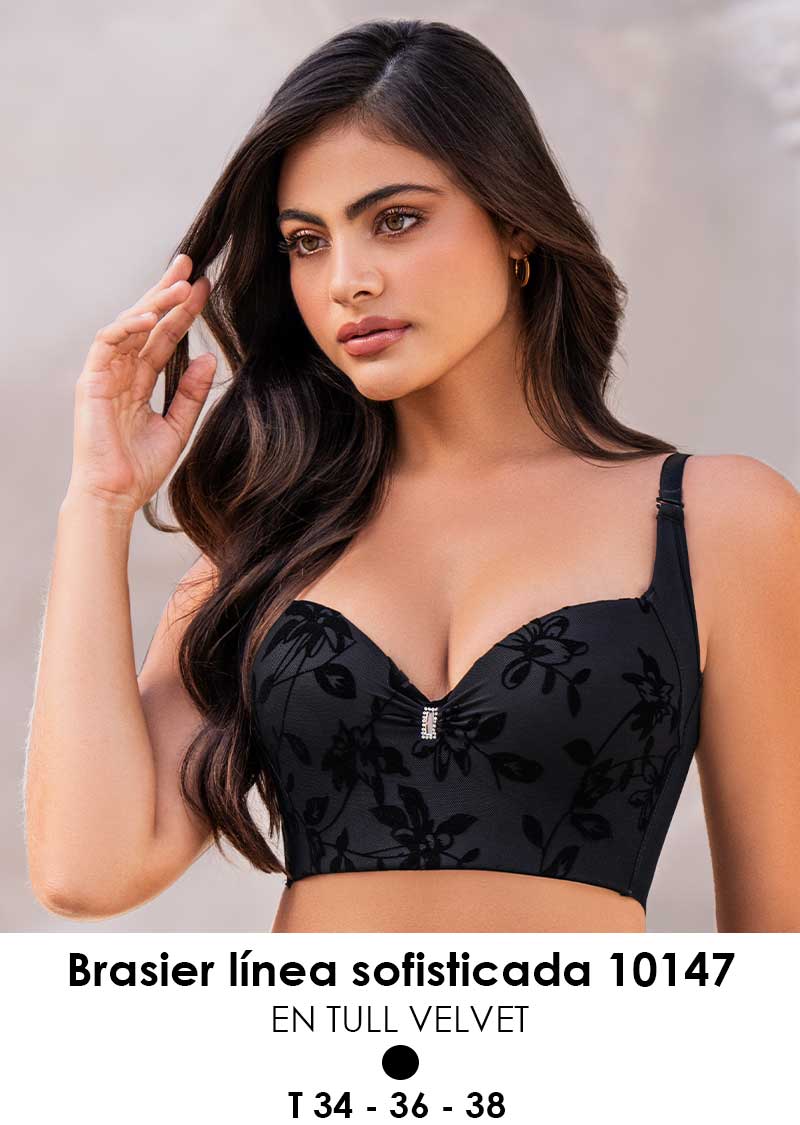 - Copa media. - Estructura de modelación y ajuste. - En tull velvet. - Refuerzo de modelación bajo el brazo. - Espalda tipo chaleco en microfibra a corte libre. - Aro y varilla lateral. - Abrochadura 6x3.