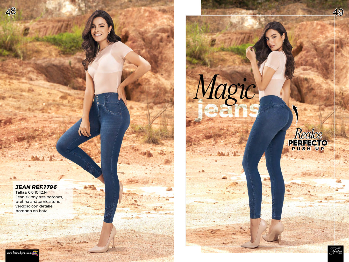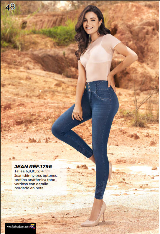 Jean skinny tres botones, pretina anatómica tono verdoso con detalle bordado en bota